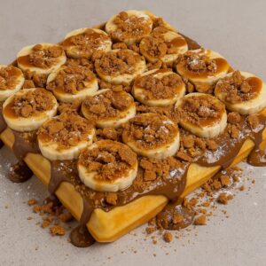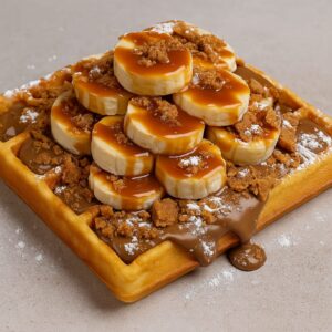 El yapımı waffle hamuru tabanı, taze muz dilimleri, karamel sos, ertilmiş sütlü belçika ...
