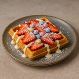 El yapımı waffle hamuru tabanı, taze çilek dilimleri, taze kivi dilimleri, eritilmiş beyaz ...